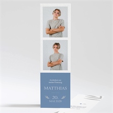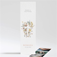 Nach dem Empfang des Sakraments der Taufe, der Erstkommunion und des Glaubensbekenntnisses bereitet sich Ihr Mädchen oder Ihr Junge darauf vor, die bei der Taufe eingegangene Verpflichtung und die Versprechen öffentlich zu erneuern? Die Firmung ist keineswegs nur eine schlichte religiöse Zeremonie, sondern ein Schritt, der im Leben eines jeden Christen eine große Bedeutung hat. Die Firmung ist eine Zeremonie, in der das Kind seinen Glauben an Jesus verkündet und gleichzeitig seinen Status als Christ bekräftigt. Am Ende der Zeremonie überreichen die Eltern allen Anwesenden traditionell eine kleine, feierliche Karte als Dankeschön. Diese Karte ist ein Andenken im Lesezeichenformat an die Firmung. MeineKarten bietet Ihnen eine ganze Reihe von Andenken an, mit denen Sie Ihren Gästen bei allen großen religiösen Ereignissen wie einer Taufe, einer Kommunion, einer Konfirmation und einer Firmung danken können. Gestalten Sie über das Gestaltungstool unserer Website das Modell, das am besten zu Ihren Einladungskarten zur Firmung passt, indem Sie ein schönes Foto des gefirmten, sowie seinen Namen und ein schönes Bibelzitat einfügen.Mehr lesen