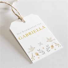 Wie wäre es, wenn Sie Ihre Tischdekoration oder Ihre Papeterie-Artikel zur Kommunion mit selbst gestalteten Geschenkanhängern verschönern würden? In dieser Kollektion finden Sie die passenden Geschenk-Anhänger zu jeder Einladungskarte zur Kommunion. In unserem Online-Shop können Sie all unsere Geschenkanhänger individuell gestalten, um Ihr Gastgeschenk, Ihre Einladungskarten oder Ihr Kirchenheft zur Kommunion, aufeinander abzustimmen. Damit auch jeder unserer Kunden ein Modell findet, das zu seiner Traum-Kommunion passt, haben unsere Grafiker extra für Sie eine große Kollektion in verschiedenen Farben (grün, beige, rosa, blau, Kraftpapier…) und in verschiedenen Designs (Vintage, Klassisch, Original, Floral, mit Illustrationen, mit Sternen) zusammengestellt. Schmökern Sie durch unseren großen Katalog und lassen Sie sich von unseren Etiketten überzeugen.Mehr lesen