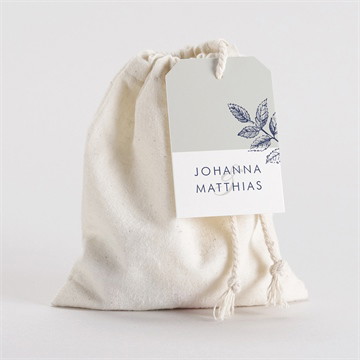 Dieses Set aus Geschenkbeutel und personalisierbaren Geschenkanhänger wartet nur darauf mit leckeren Zuckermandeln oder Schokoladen-Dragées gefüllt zu werden. Diese finden Sie ebenfalls in unserer großen Hochzeitskollektion. Der Geschenkanhänger kann während des Bestellvorgangs online bearbeitet werden.