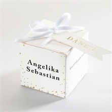 Zu Ihrer Hochzeit sind alle Ihre Verwandten, Freunde, Kollegen und Familienmitglieder gekommen. Sie haben Sie an diesem Tag begleitet, Ihnen gratuliert, viele Geschenke überreicht und durch ihre Anwesenheit zum Erfolg dieser Veranstaltung beigetragen. Sie möchten, dass sie diese Feier mit einem einzigartigen Andenken verlassen? Bedanken Sie sich mit einem kleinen Geschenk für all das, was sie für Sie und Ihre Hochzeit getan haben. Passend für diesen Anlass bieten wir zu jeder Hochzeitspapeterie-Kollektion kleine Gastgeschenkboxen oder auch Überraschungs-Boxen im gleichen Design.