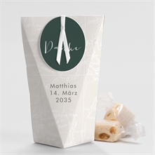 Wenn Sie eine einheitlich schöne Papeterie-Kollektion zur Jugendweihe erstellen möchten, empfehlen wir Ihnen, die Geschenkbox aus der gleichen Kollektion wie Ihre Einladungskarte zur Jugendweihe auszuwählen. So passen Farben, Illustrationen und Schriftarten perfekt zusammen. Auf unserer Webseite finden Sie ebenfalls leckere Zuckermandeln zur Jugendweihe, mit denen Sie jede individuell gestaltete Geschenkbox befüllen können. Neben traditionellen weißen Zuckermandeln bieten wir auch eine bunte Kollektion an Schokoladen-Dragees an. Die Farbe der Dragees können Sie entweder an Ihre Geschenkbox anpassen oder ganz farbenfroh zusammenstellen.Mehr lesen