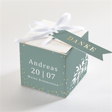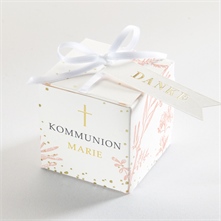 Heutzutage ist es bei einer großen Party wie bei einer Geburt, einem Geburtstag, einer Taufe, einer Kommunion, einer Konfirmation oder auch einer Hochzeit üblich, Gastgeschenke an alle Anwesenden zu verteilen. Diese kleine Geste zeigt Ihren Liebsten wie wichtig Ihnen Ihre Anwesenheit ist. Geschenkboxen eignen sich hervorragend als personalisiertes Gastgeschenk. Schmökern Sie durch unseren großen Katalog aus unterschiedlichen Designs und Farbwelten und entscheiden Sie sich noch heute für Ihr Lieblingsmodell. Für ein stilvolles Papeterie-Ensemble empfehlen wir Ihnen die Geschenkbox aus der gleichen Kollektion, wie auch Ihre Einladungskarten zur Kommunion zu wählen. Füllen Sie die gewählten Geschenkboxen mit leckeren Zuckermandeln zur Kommunion und hinterlassen Sie Ihren Liebsten so ein schönes Andenken an die Kommunion Ihres Kindes.Mehr lesen