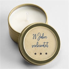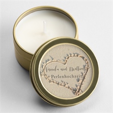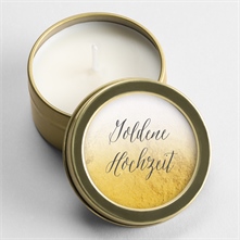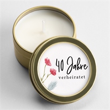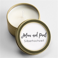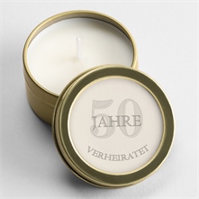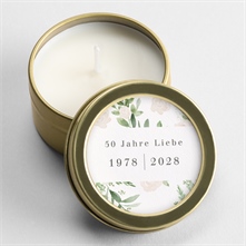 Feiern Sie Ihre Silberhochzeit, Goldene Hochzeit oder Diamantene Hochzeit mit unseren personalisierten Dosen-Kerzen, die jeden Hochzeitstag zu etwas Besonderem machen. Jede Kerze wird mit viel Liebe und Sorgfalt gefertigt und kann individuell mit Namen, Daten oder einer persönlichen Botschaft gestaltet werden. Unsere Kerzen zum Hochzeitsjubiläum sind nicht nur elegante Dekorationen, sondern auch bleibende Erinnerungen. Sie verbinden stilvolles Design mit symbolischer Bedeutung und eignen sich perfekt als Geschenk für das Jubiläum eines lieben Paares. Wählen Sie in unserem Katalog aus unterschiedlichen Farben und Designs Ihr Lieblingsmodell aus und gestalten Sie den Aufkleber der Kerze direkt online über unser Online-Gestaltungstool, um die Kerze perfekt an Ihre Feier anzupassen. Mit einer individuell gestalteten Kerze verleihen Sie Ihrer Feier einen persönlichen Touch und machen den Hochzeitstag für alle unvergesslich. Ob als liebevolles Geschenk oder als besondere Dekoration auf dem Tisch – unsere Dosen-Kerzen setzen stilvolle Akzente und bleiben noch lange in Erinnerung.Mehr lesen