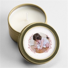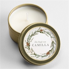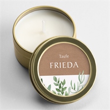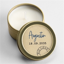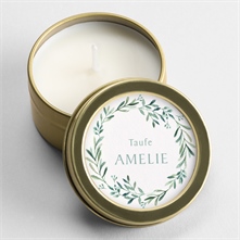 Ihr kleiner Liebling hat Ihr Leben schon seit einigen Monaten erhellt und nun ist es an der Zeit, ihn zu taufen. Sie stecken mitten in den Vorbereitungen? Und haben vielleicht auch schon eine unserer Geschenkboxen zur Taufe und die passenden Taufmandeln ausgesucht? Um Ihre Tischdeko zu vervollständigen und Ihre Gäste mit einem weiteren kleinen Gastgeschenk zu überraschen, ist diese personalisierte Kerze die perfekte Wahl. Die Sticker auf dem Deckel der Metalldose können Sie online ganz einfach gestalten und so an die Deko Ihrer Taufe anpassen.Mehr lesen