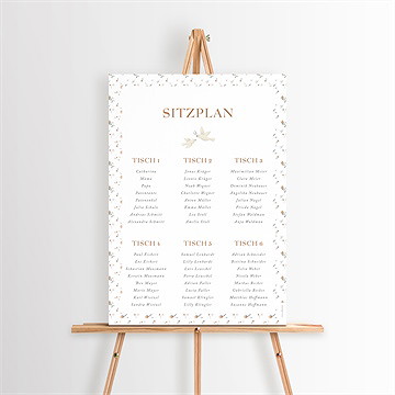 Falls Sie kein spezifisches Thema gewählt haben, können Sie sich ganz frei für einen Sitzplan entscheiden. Wählen Sie ein Design, das sich harmonisch in Ihre weiteren Deko-Elemente, die Sie für die Veranstaltung ausgewählt haben, einfügt. Oder wählen Sie einen schlichten Plan mit filigranen Pflanzenillustrationen oder religiösen Symbolen, wie einem Kreuz oder einem Ictus-Fisch.