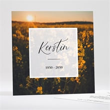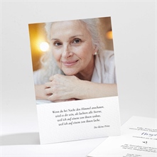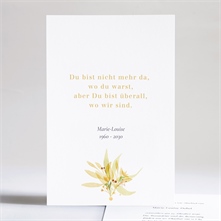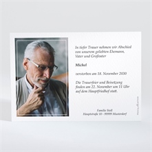 Unsere Grafiker haben für Sie eine spezielle Reihe von Karten entworfen, um allen Ihren Vorstellungen einer perfekten Trauerkarte gerecht zu werden: Entdecken Sie unsere Trauerkarten mit schlichten und eleganten Designs, in sanften und klassischen Farben, Modelle mit und ohne Foto, mit floralen oder religiösen Illustrationen, farbenfroh oder ganz dezent in schwarz-weiß, mit Veredelung oder gar einer filigranen Prägung… wir sind sicher, dass Sie in unserer großen Kollektion ein Modell finden werden, das Ihrer geliebten, verstorbenen Person entspricht und der Abschiedszeremonie, die Sie sich für Ihn vorstellen, gerecht wird.