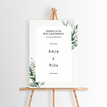 Ein Willkommensschild kann vor dem Eingang des Empfangsortes aufgestellt werden, um Ihre Gäste zu begrüßen und eine dekorative Note im Außenbereich der Location hinzuzufügen. Alternativ kann das Schild aber auch an einem anderen strategischen Punkt platziert werden. Beispielsweise in der Nähe des Geschenketisches und des Gästebuchs.